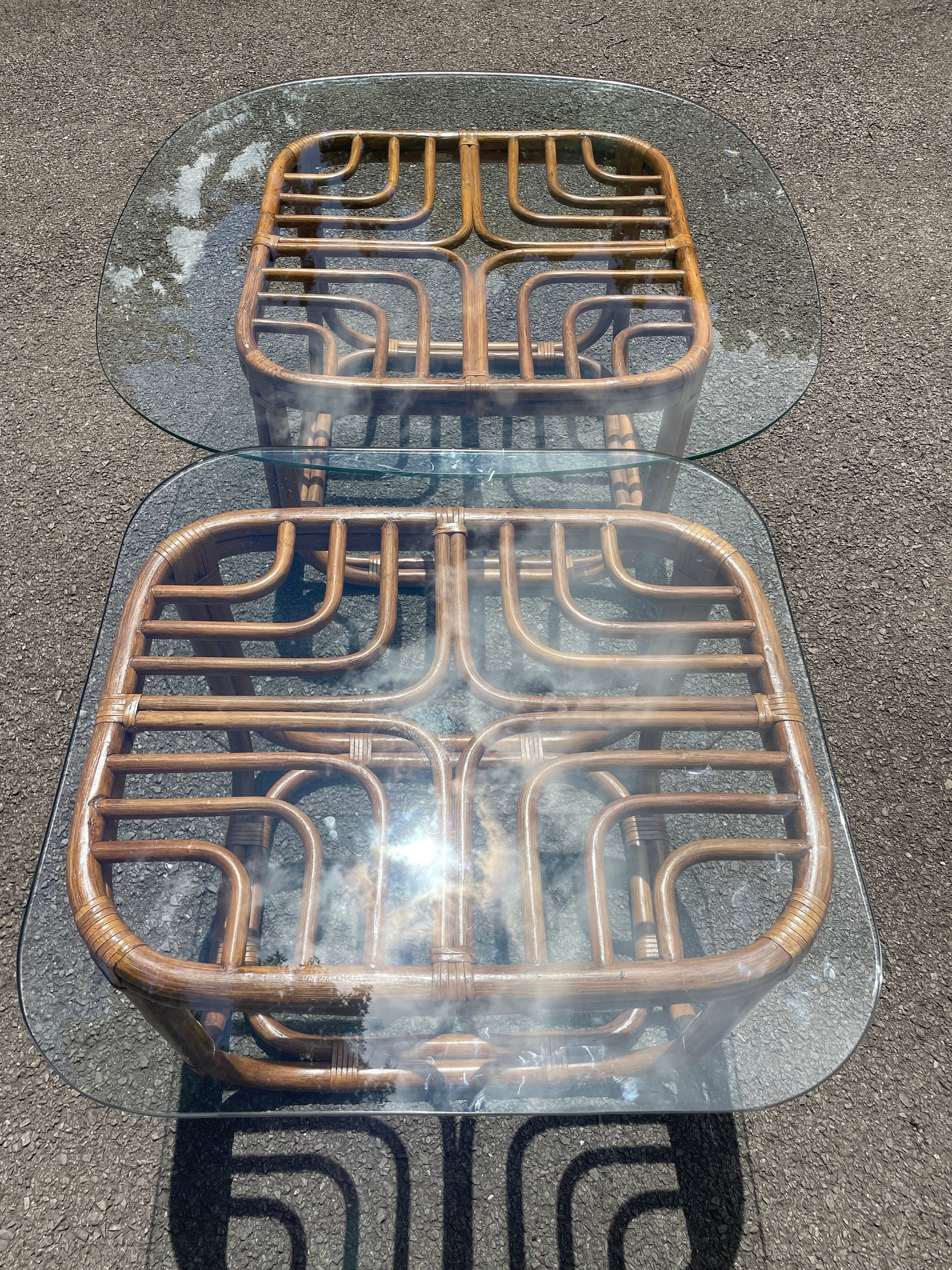 These boho chic matching lamp tables reflect the iconic Brown Jordan patio aesthetic. The pair of tables make versatile additions to any living space, as a coffee and side table, or pair of side tables, as bedside tables, or side tables for patio or porch.