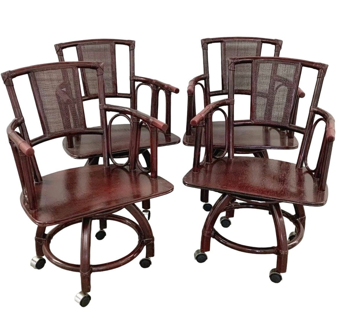 Swivel rattan chairs with cane backrest and matching rattan table with round top.