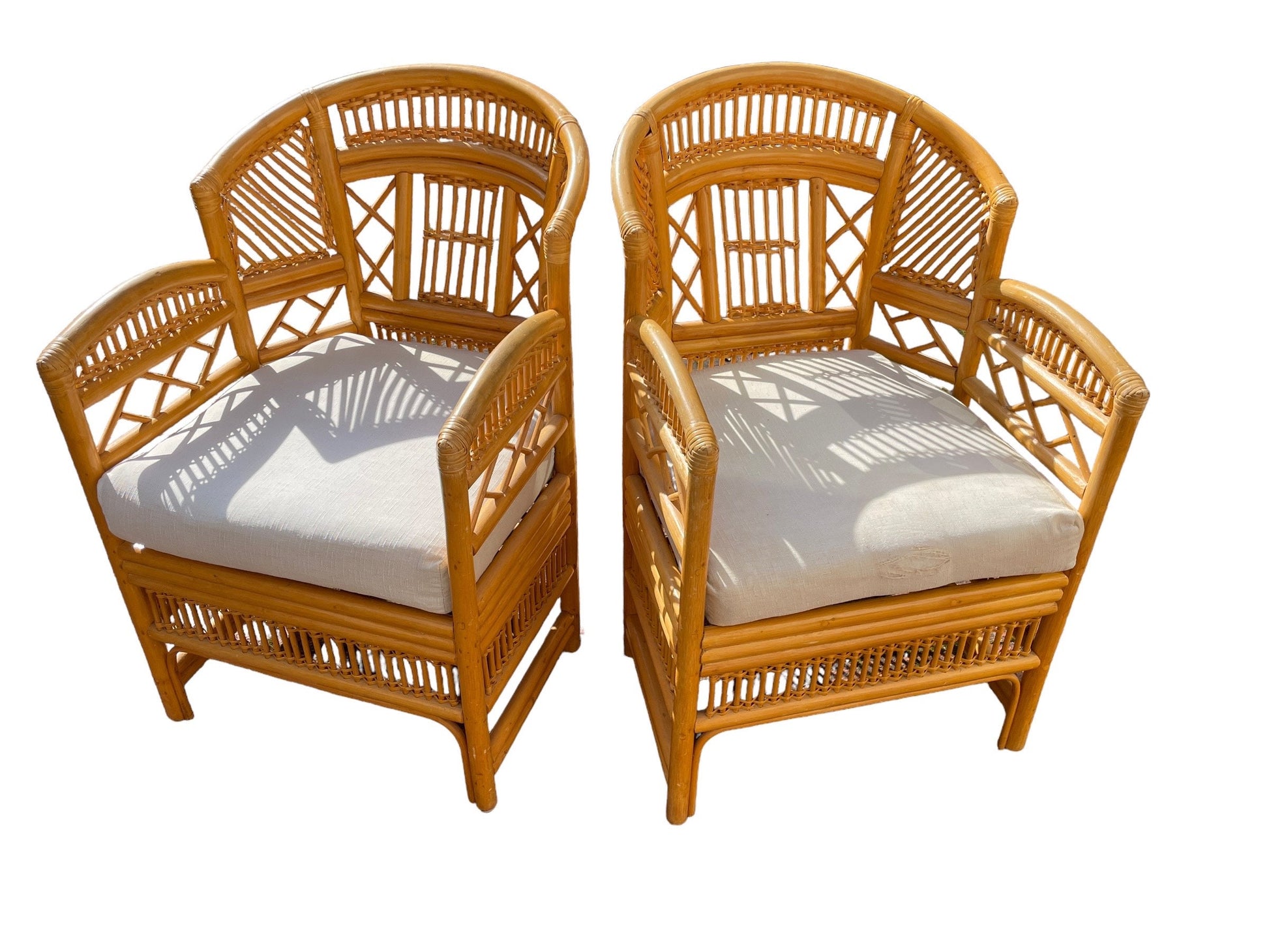 Vintage pair of Brighton Pavilion style burnt bamboo side chairs with wood seats. Chairs are in immaculate condition. These are vintage handmade chairs and rare to find in a pair in this pristine condition.