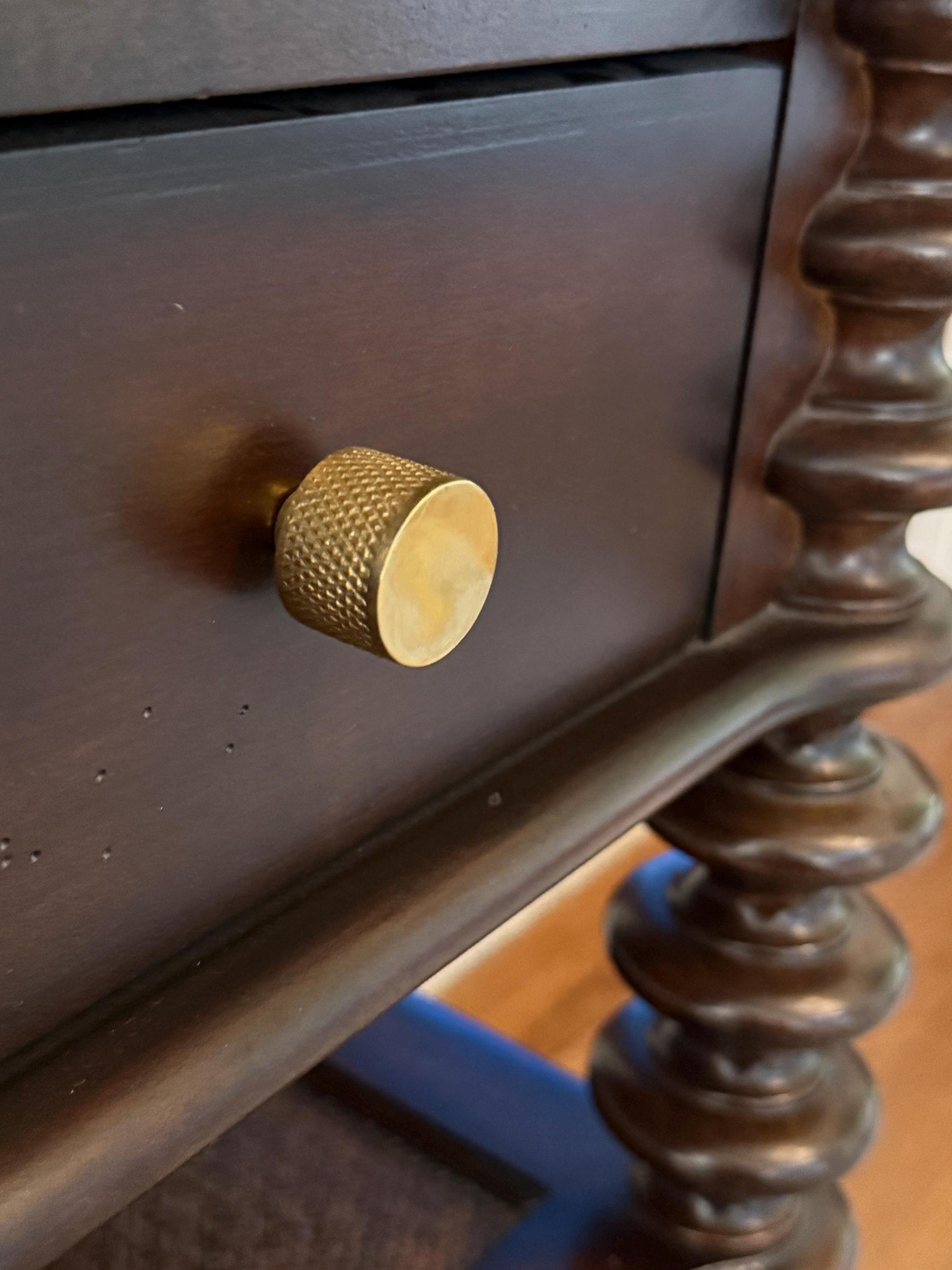 Elegant Georgian style console table with 2 drawers and 2 shelves. Brass knobs and spindle legs make for a classic and eye catching piece for an entryway, hallway, sofa table, or dining room.