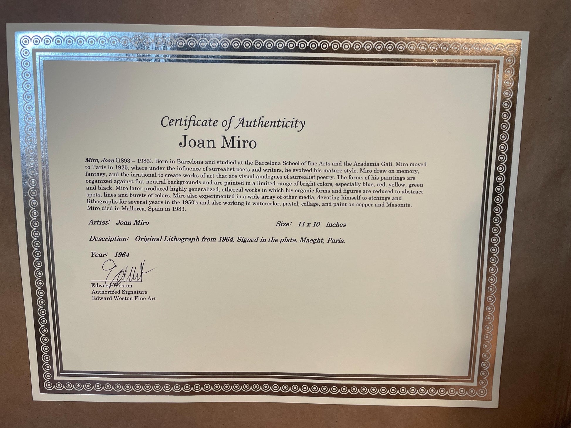 Joan Miro color plate lithograph on paper. Approximately 26x22 inches. Custom framed and includes certificate of authenticity.