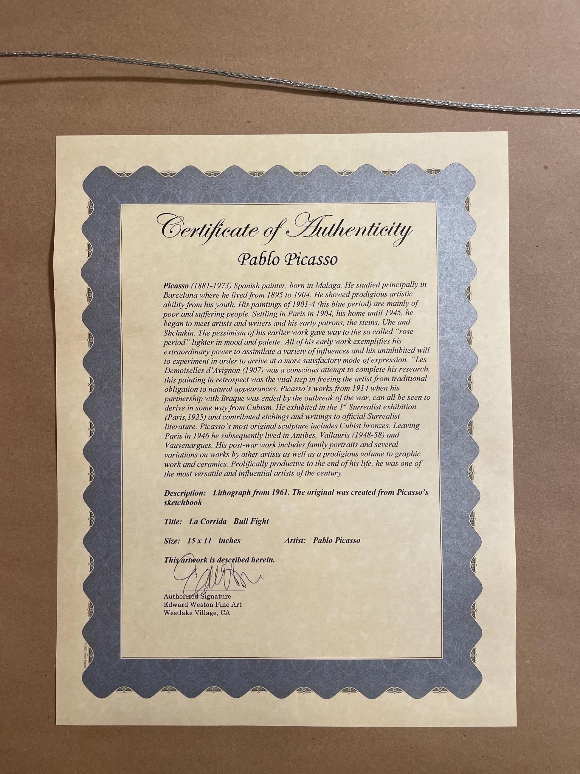 Pablo Picasso lithograph from 1961. Includes certificate of authenticity. Approximately 20 x 18 inches. Custom framed. Printed In Paris. Dated 1959 by the artist. From Picasso‘s sketchbook from 1959.