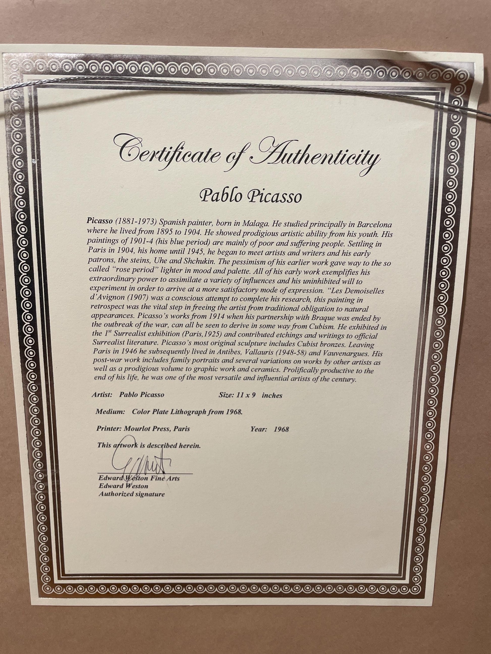 Pablo Picasso Original Lithograph from 1966. Approximately 24x20 inches, and custom framed. Includes certificate of authenticity.
