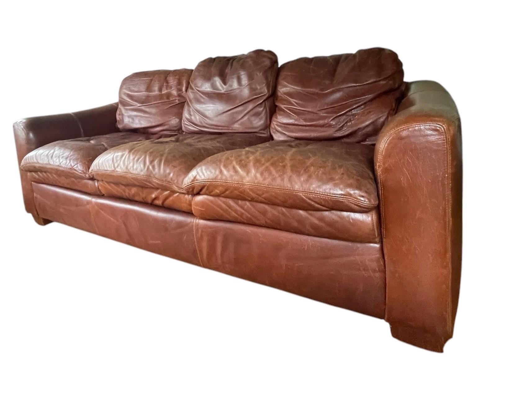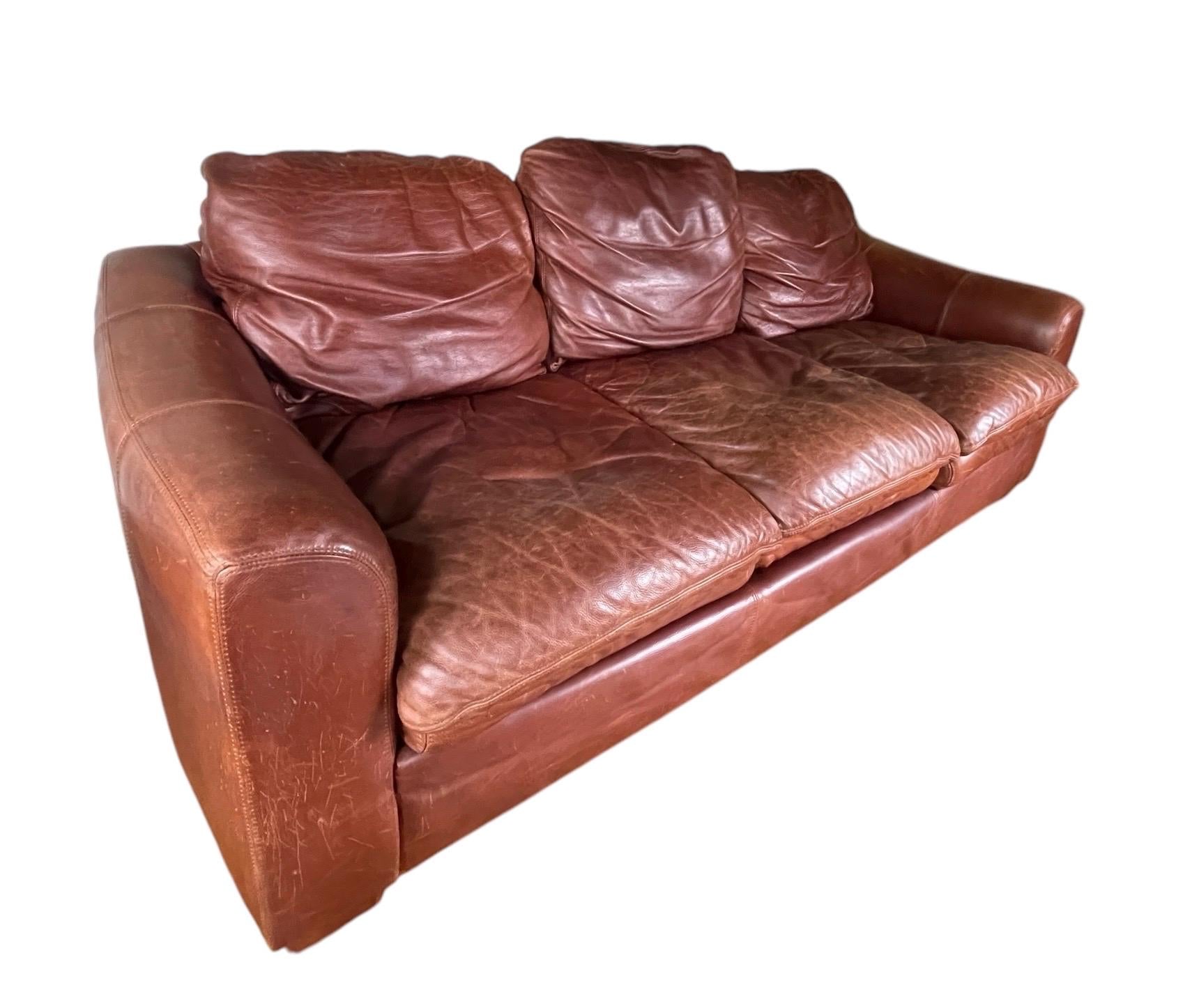 Stunning vintage distressed leather sofa in the style of Restoration Hardware and vintage Ralph Lauren. In gorgeous vintage condition with thick layers of leather to sink into. many years of life left in this patina rich caramel leather sofa. Any scratches seem to add to the distressed charm..