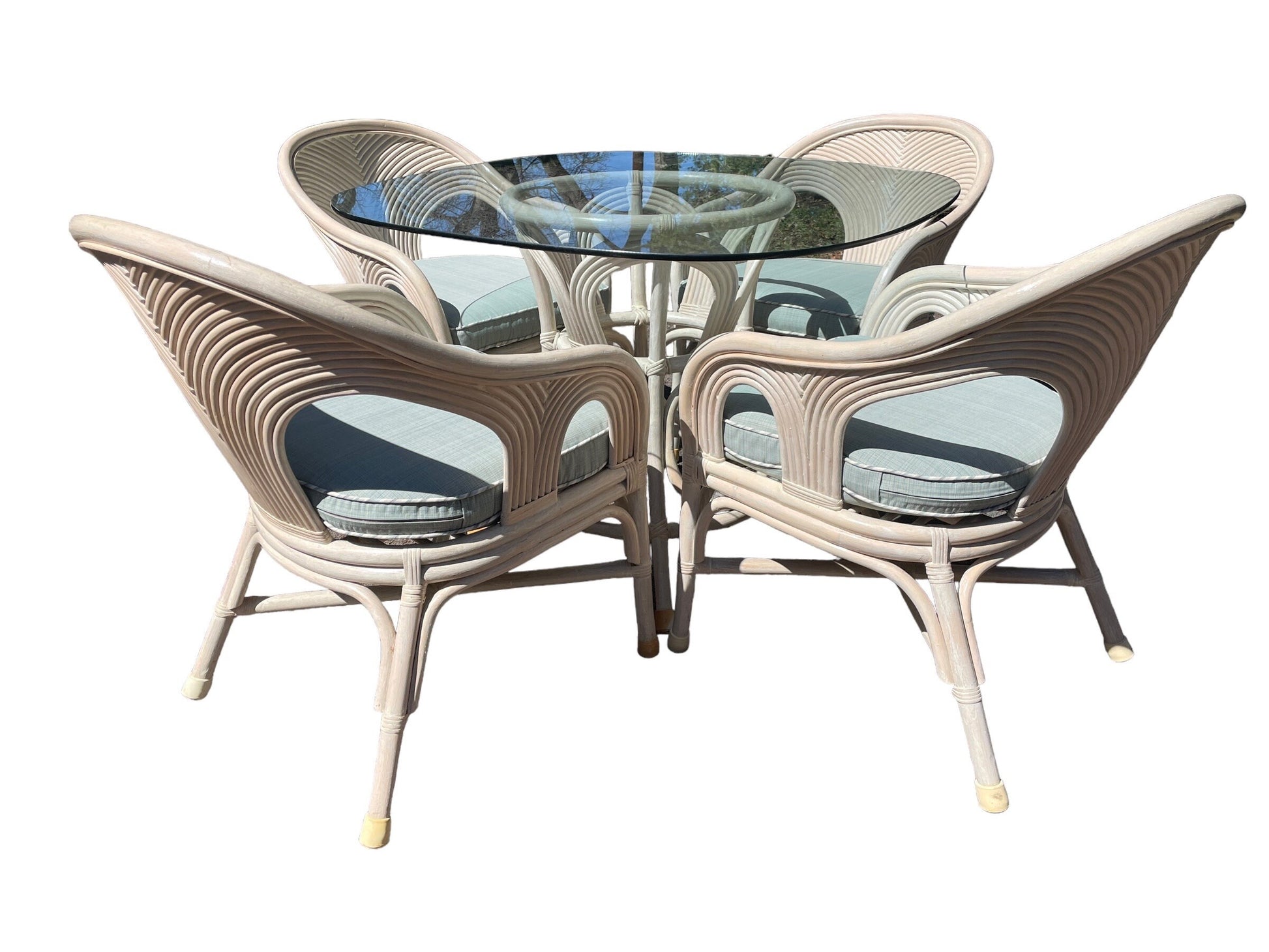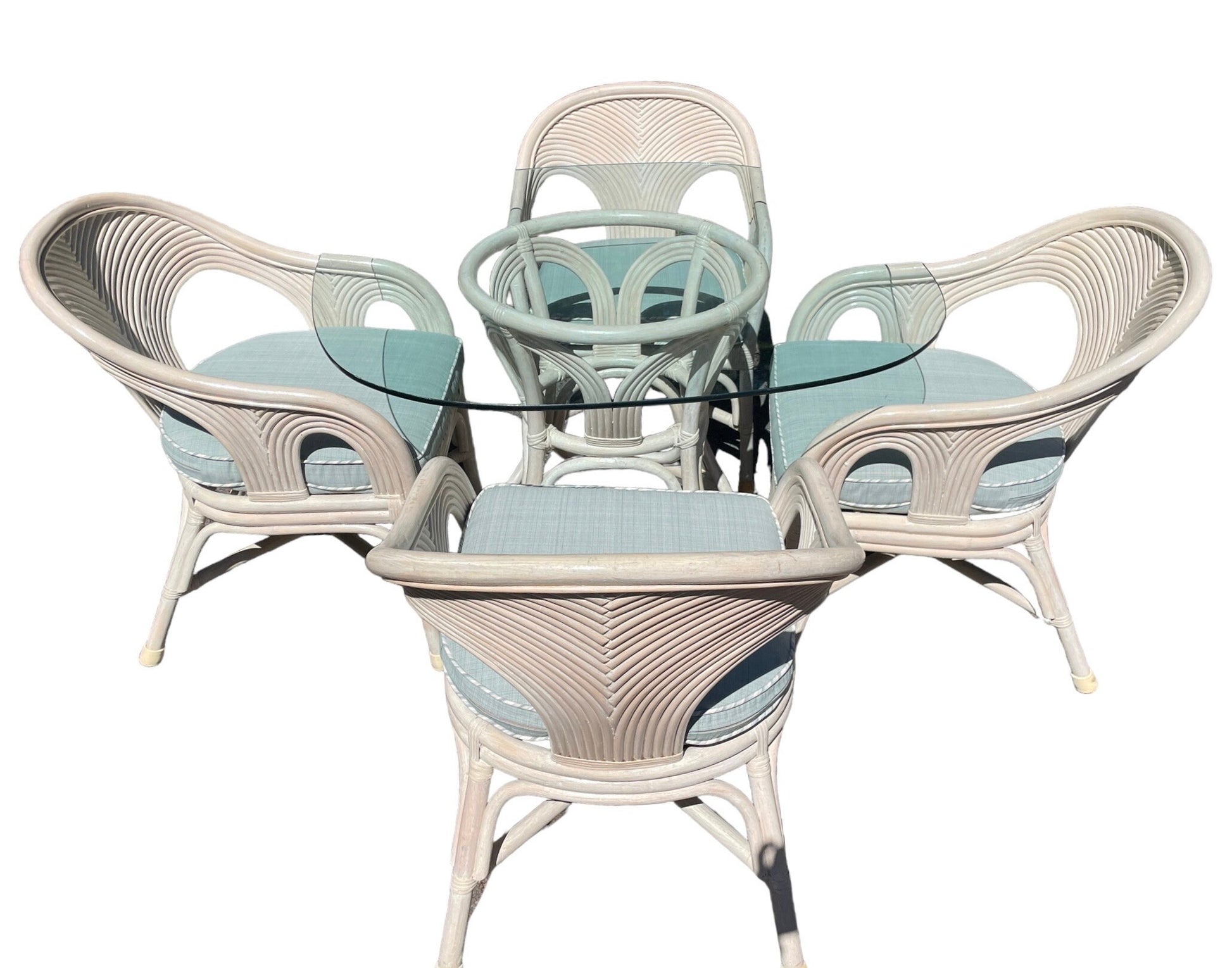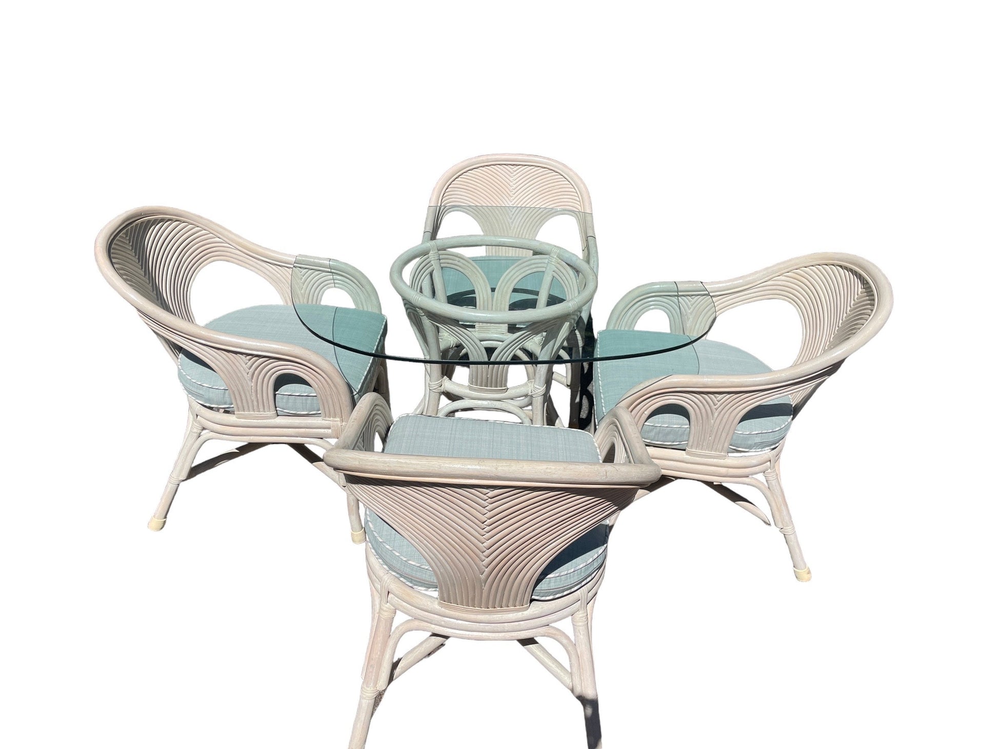 This superb rattan reed dining set is reminiscent of Gabriella Crespis style. 4 solid dining armchairs with light blue seat pillows. Dining table with heavy beveled glass top, beautiful angles!