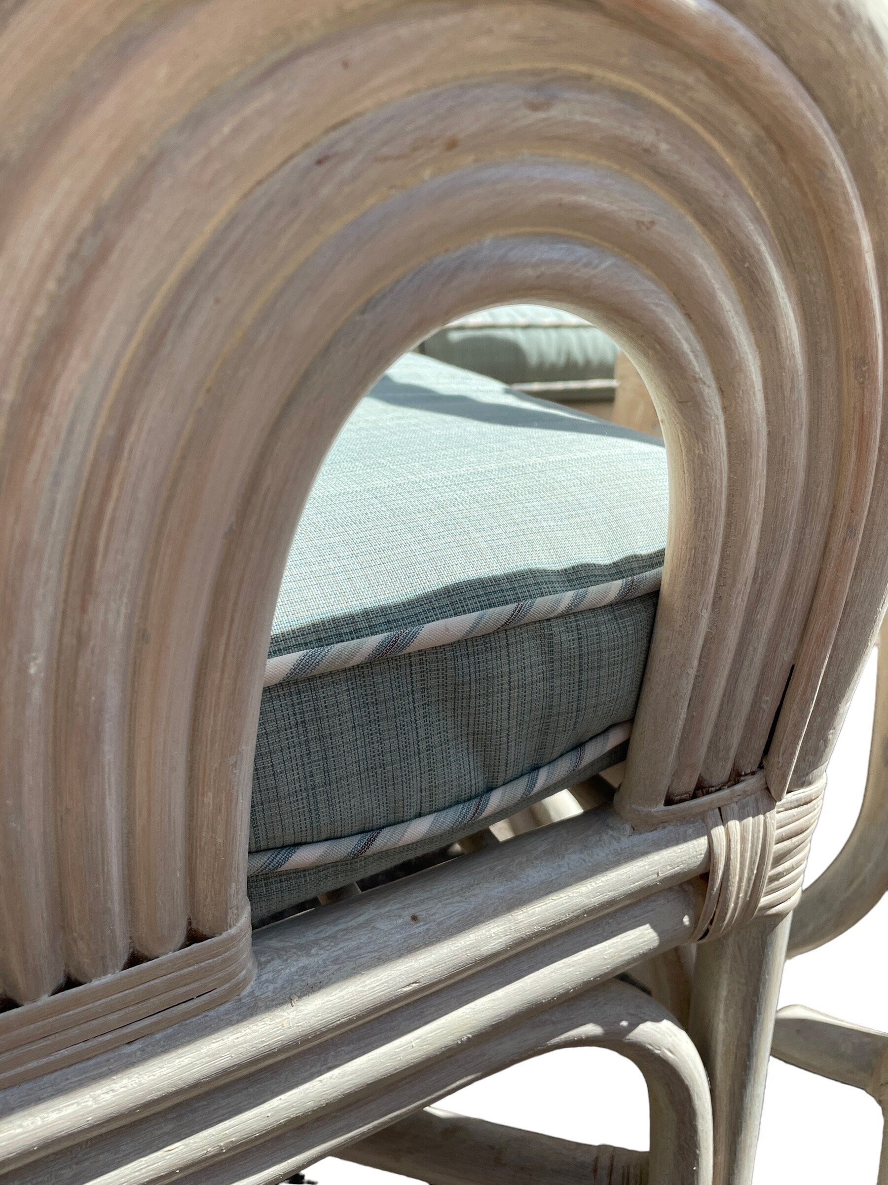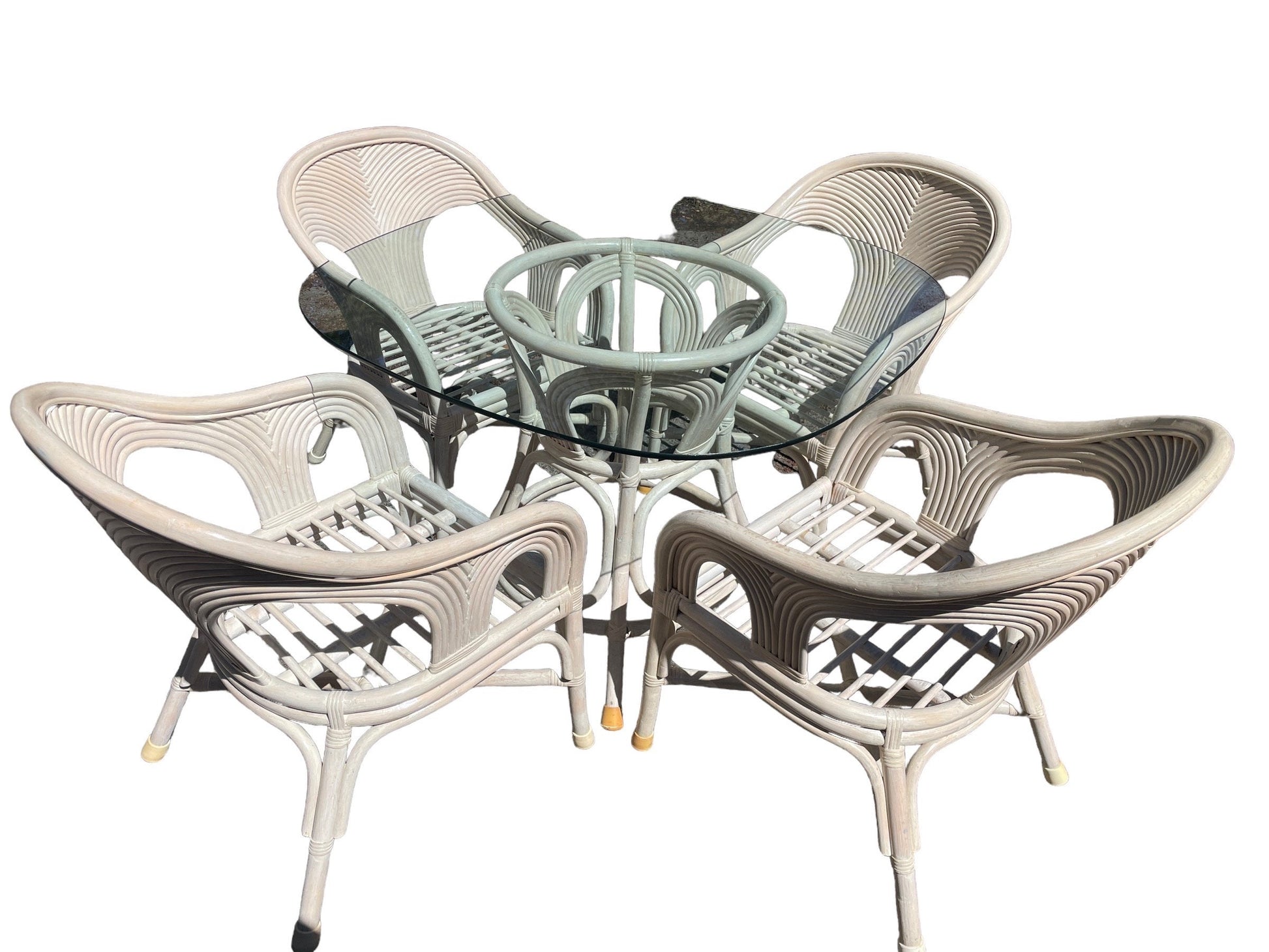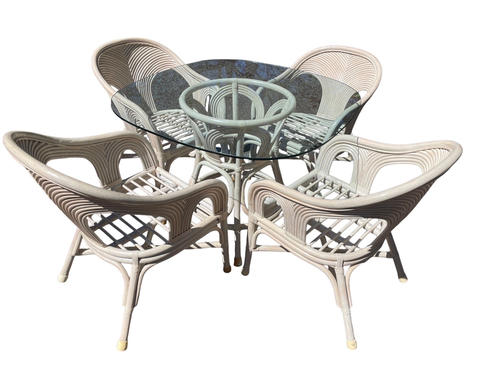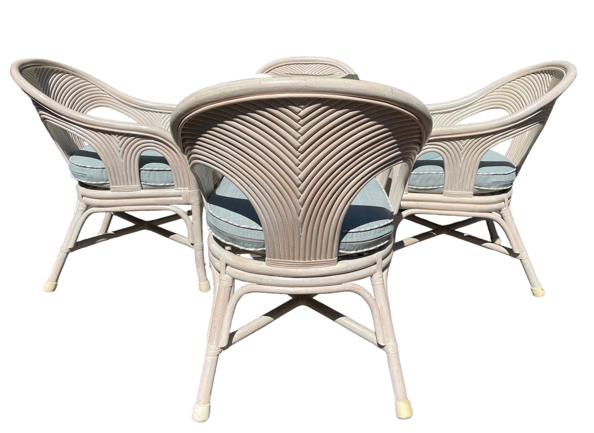 This superb rattan reed dining set is reminiscent of Gabriella Crespis style. 4 solid dining armchairs with light blue seat pillows. Dining table with heavy beveled glass top, beautiful angles!
